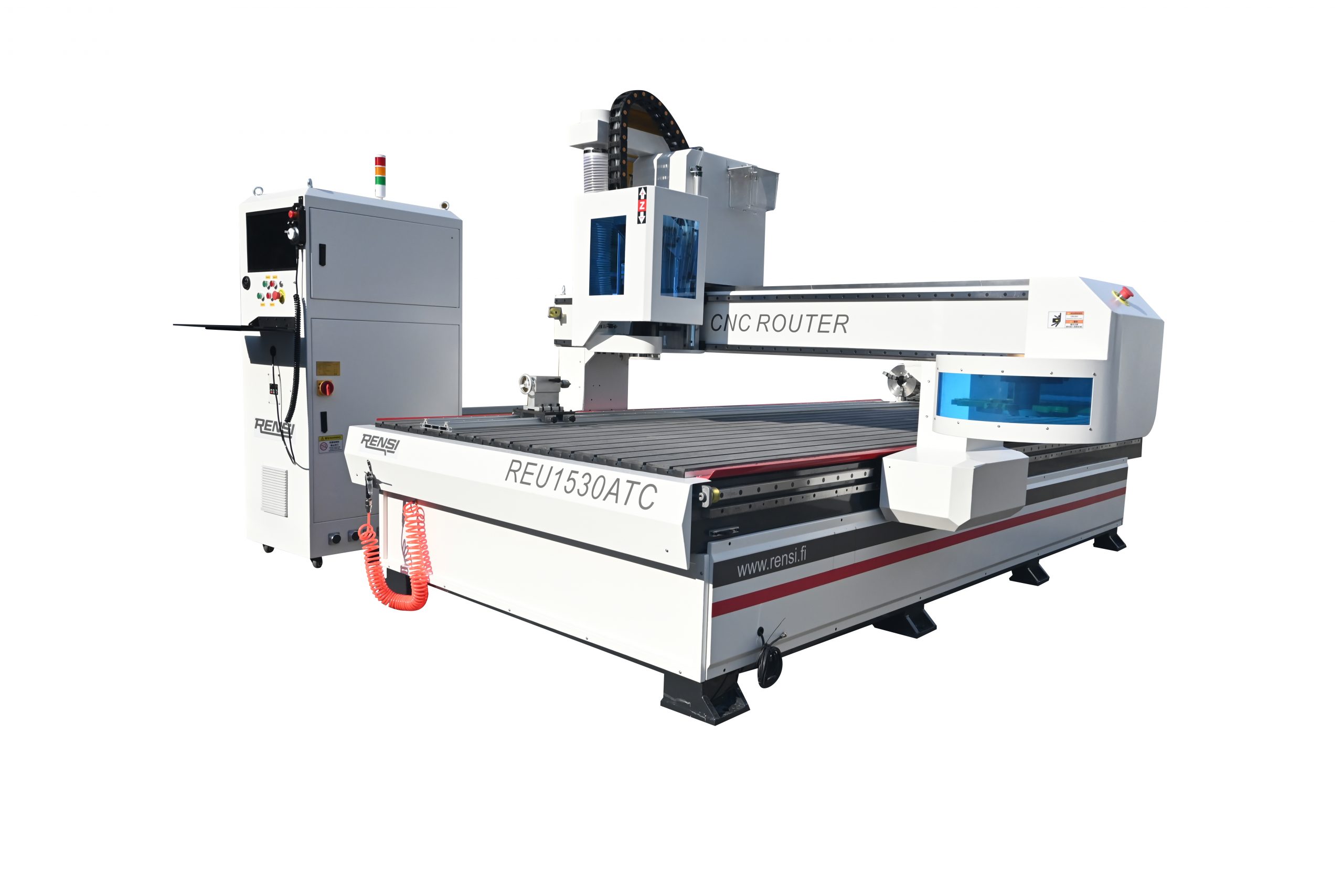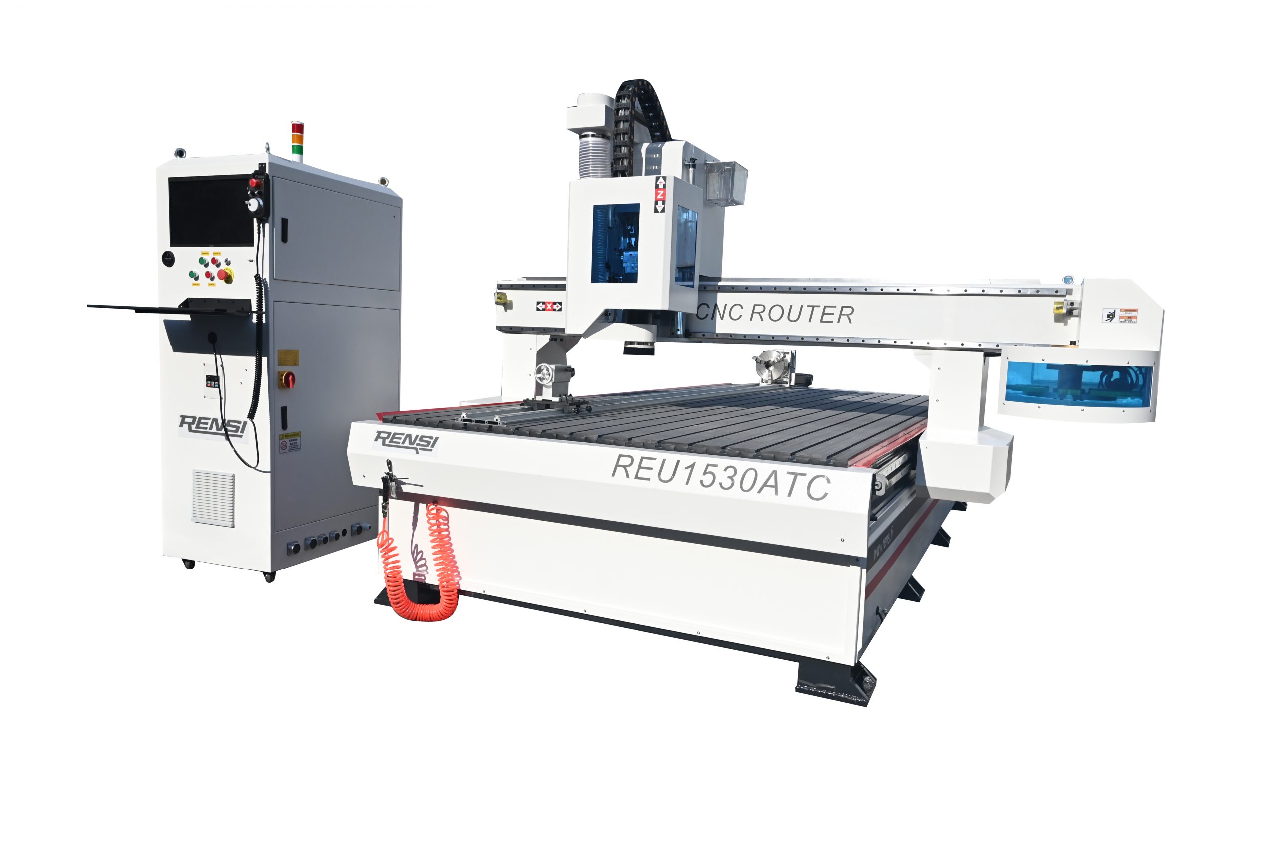 The CNC Routers are with automatic tool changers and a rotary tables. The rotary tables can be removed from the machines. The rotary tables drive the workpieces to rotate, while the spindles perform cutting and engraving, thus achieving continuous, smooth, and precise 360-degree engraving.