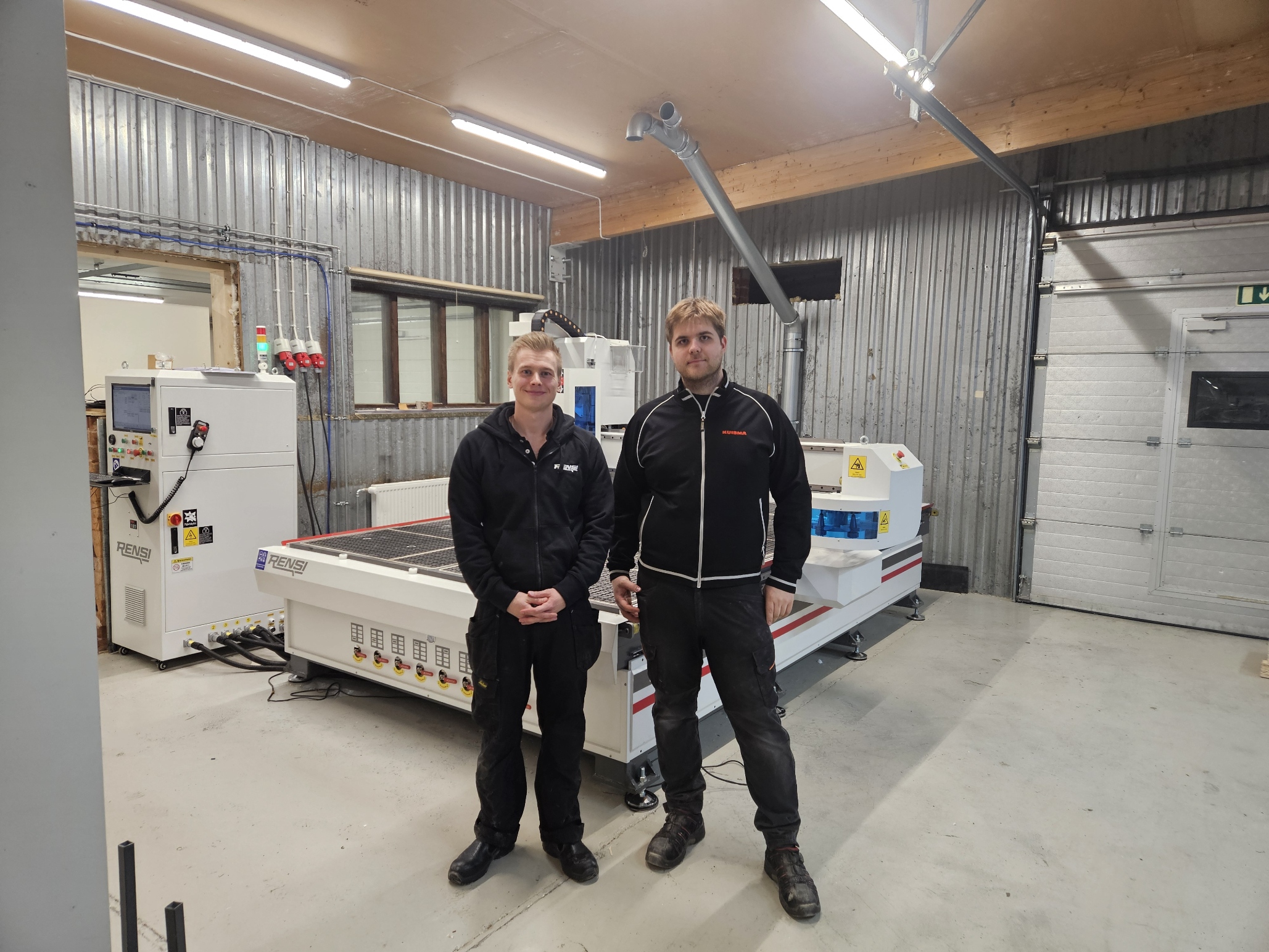 Uuden CNC-Routerin edessä Rensin myyntipäällikkö Väinö Uutela ja Kuisman tuotantovastaava Matias Kuisma.