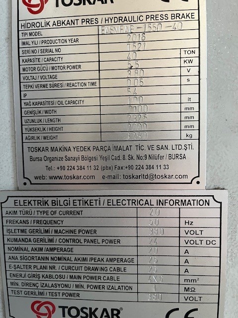 Hyvässä kunnossa oleva toimiva 2016 mallinTOSKAR hydraulinen särmäyspuristin myydään vähäisen käytön vuoksi.